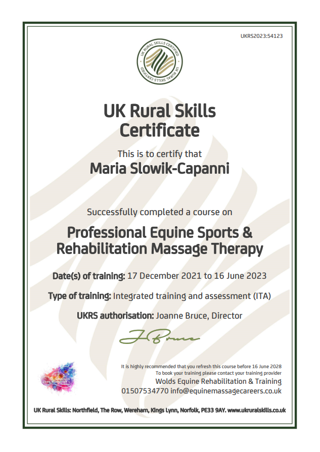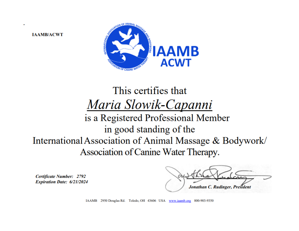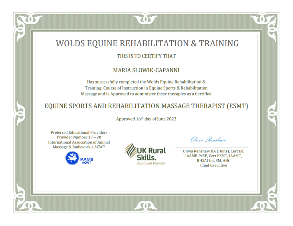 I am a registered member of The International Association of Animal Massage and Bodywork / Association of Canine Water Therapy (IAAMB/ACWT) and have completed the Practitioner Course In Equine Sport and Rehabilitation Massage Therapy with Wolds Equine Rehabilitation & Training.